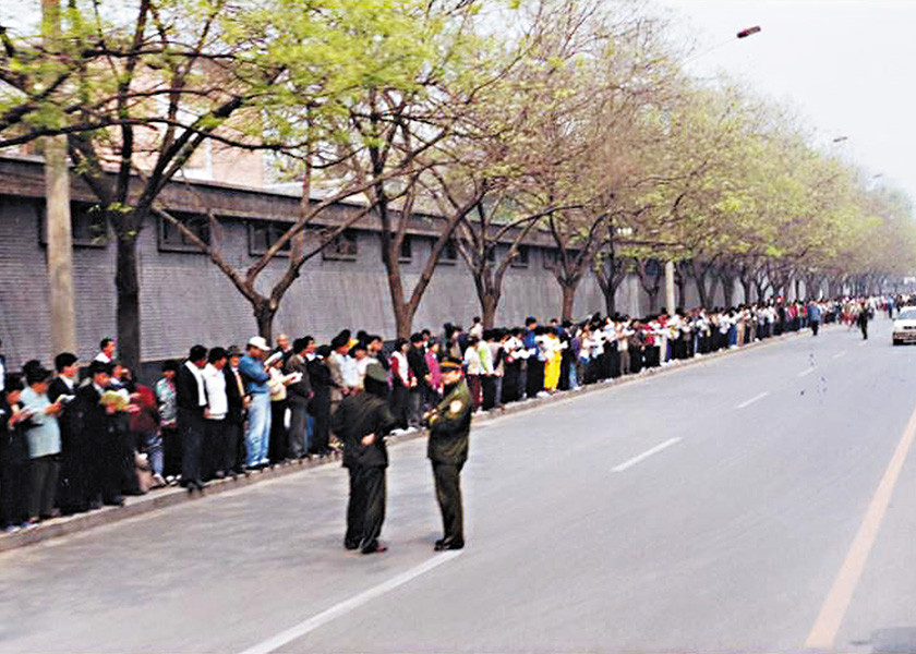 Pēc Faluņgun praktizētāju aizturēšanas Tiaņdzjiņā 1999. gada aprīlī, apmēram 10 000 praktizētāju 25. aprīlī mierīgi pulcējās pie Valsts apelāciju biroja Pekinā, lai pieprasītu aizturēto atbrīvošanu un konstitūcijā noteiktās tiesības praktizēt savu ticību -